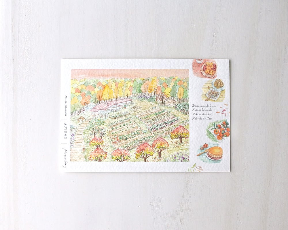「栗の殻剥き」「柿の収穫」など秋のワンシーンを添え、絵葉書のような雰囲気に仕上げています。