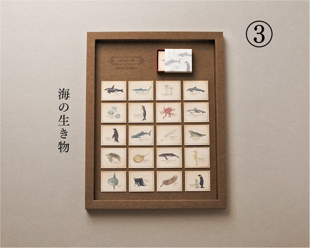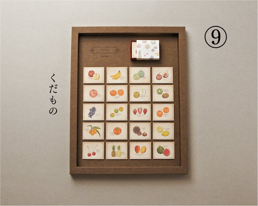 「図鑑風小さなメッセージカードBOX」を1/4サイズに縮小した、紙製フレームのミニチュアインテリア。小さな図鑑の雰囲気を表現しました。