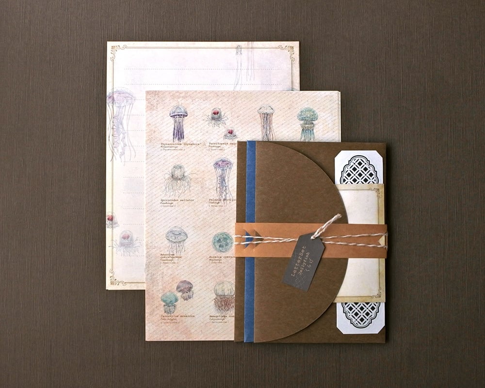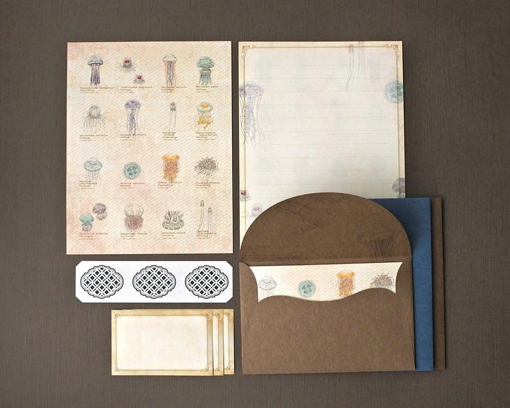 ヤナギクラゲやベニクラゲなど様々なくらげを図鑑風にデザインして学名・科目などを添え、シックなデザインに仕上げたレターセットです。
