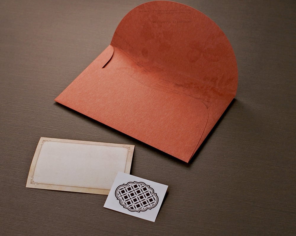 バーミリオンカラーの封筒は風合いのある優しい手ざわりの紙で、やわらかな曲線を使い、内側にモノトーンの絵柄をプリントしています。