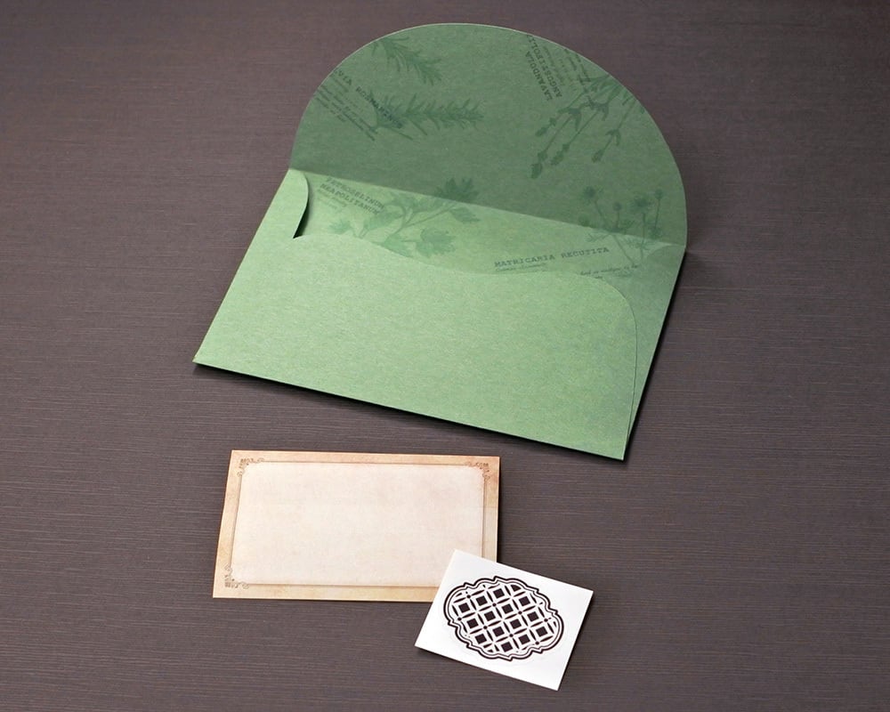 フレッシュグリーンの封筒は風合いのある優しい手ざわりの紙で、やわらかな曲線を使い、内側にモノトーンの絵柄をプリントしています。