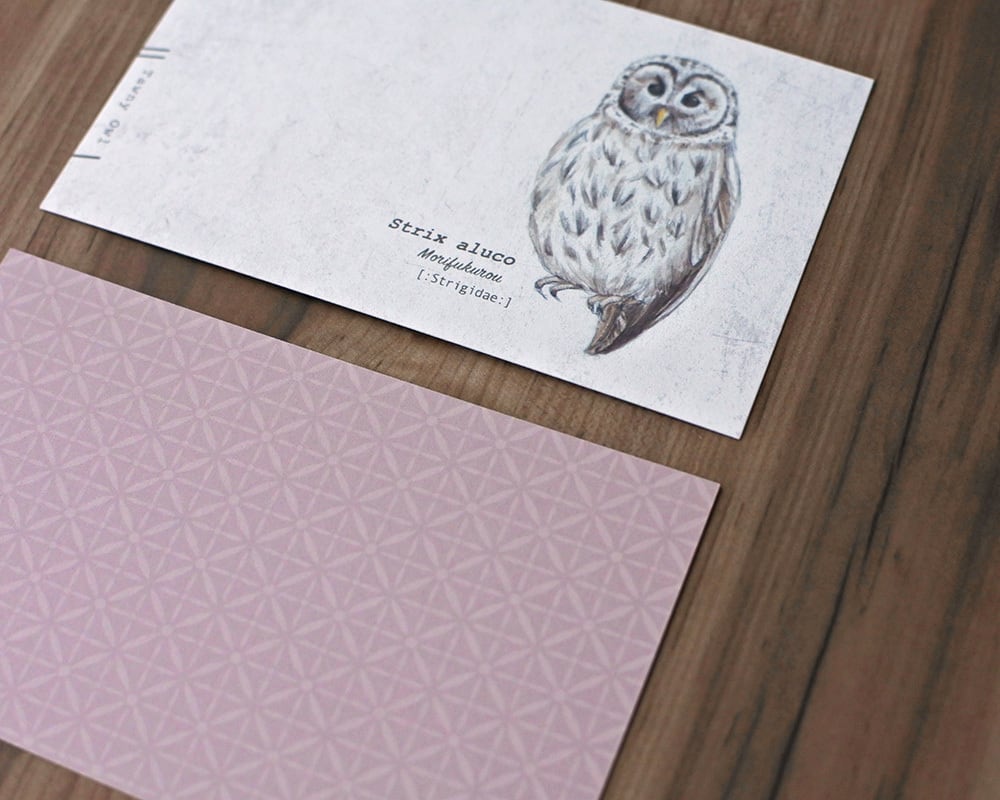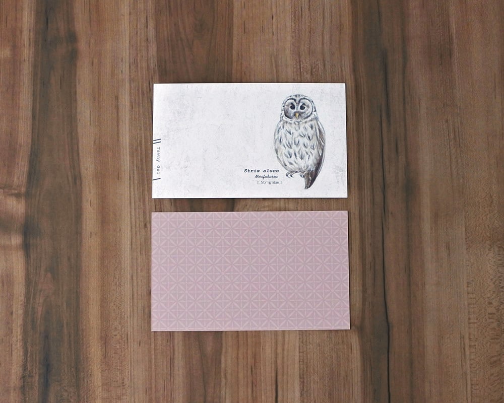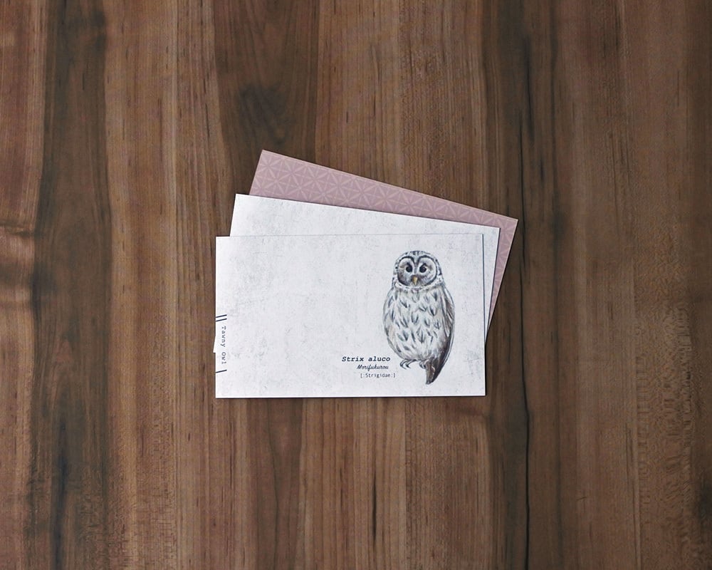 幸運のモチーフであるふくろうをモチーフに、「動物たちの名刺」のようなイメージでデザインしたメッセージカードです。