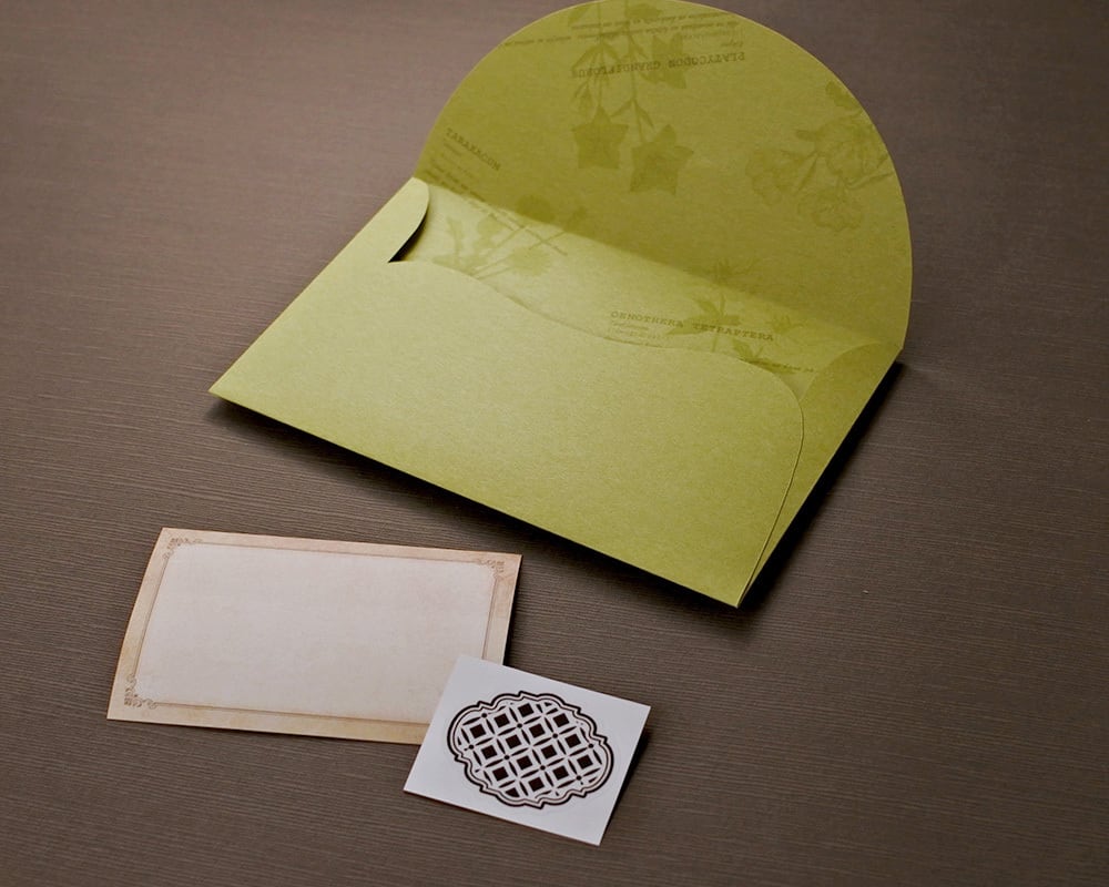 ライトグリーンの封筒は風合いのある優しい手ざわりの紙で、やわらかな曲線を使い、内側にモノトーンの絵柄をプリントしています。